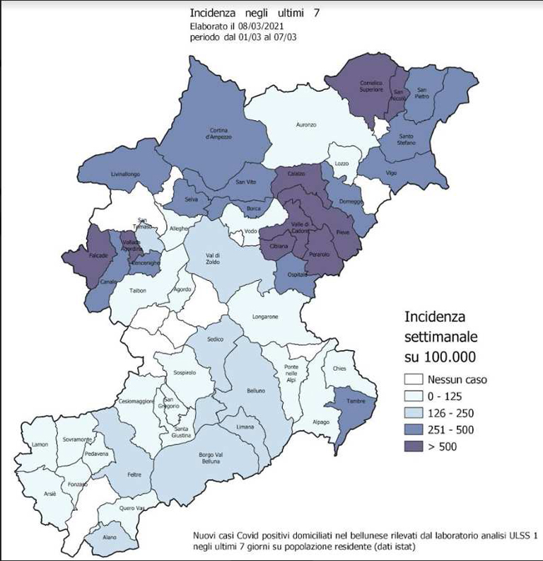 Sempre oggi pomeriggio l’Ulss Dolomiti ha diffuso i dati dell’incidenza dei contagi a livello comunale (vedi la cartina sopra) evidenziando che 9 Comuni sono oltre quota 500 (Falcade, Vallada, Cibiana, Valle di Cadore, Perarolo, Pieve di Cadore, Calalzo, San Nicolò e Comelico Superiore). Altri 13 Comuni hanno un’incidenza tra 251 e 500: Tambre, Canale d’Agordo, Cencenighe, Livinallongo, Selva di Cadore, Cortina, San Vito, Borca, Ospitale, Domegge, Vigo, Santo Stefano, San Pietro.