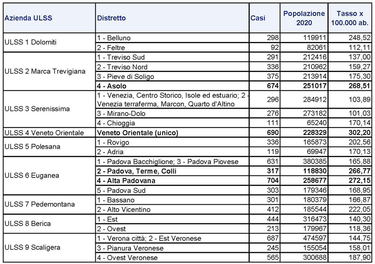 In Veneto sono 4 i distretti sanitari che superano quota 250: nell’Ulss 2 Marca Trevigiana quello di Asolo con 268,51, nell’Ulss 6 Euganea quello di Padova–Terme–Colli con 266,77 e quello dell’Alta Padovana con 272,12 e il distretto unico dell’Ulss Veneto Orientale con 302,20. Per questi la Regione disporrà nei prossimi giorni la didattica a distanza, probabilmente a partire dalla seconda media (vengono invece esclusi, almeno per il momento, interventi a livello comunale per non penalizzare le realtà più piccole).