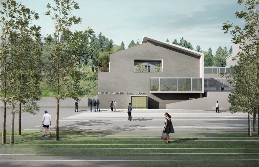 Per quanto riguarda l’organizzazione degli spazi, il progetto prevede un atrio al primo piano pensato come luogo di socializzazione per gli studenti, con un’ampia vetrata. Al piano superiore verranno realizzati 6 laboratori dedicati alle materie di indirizzo (fisica, chimica, analisi chimico agrarie, genio rurale, microbiologia e fitopatologia/biologia), oltre ai servizi e a un locale tecnico. Inoltre, è prevista anche una terrazza esterna che viene recuperata come spazio ricreativo. Il piano terra, vale a dire la palestra, vedrà la demolizione dell’attuale spogliatoio, del magazzino degli attrezzi e dell’aula professori. Al loro posto saranno realizzati un locale infermeria, un locale break, spogliatoi separati uomini-donne dotati di docce e un unico deposito per le attrezzature sportive. Infine, la nuova bussola di ingresso della palestra permetterà un accesso diretto e indipendente della struttura.