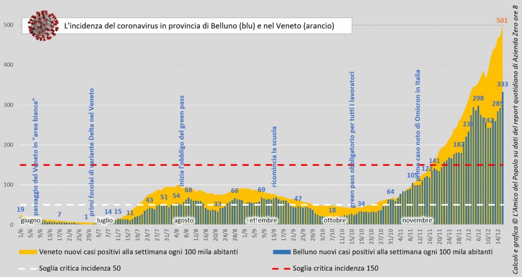 Il calcolo dell’Amico del Popolo viene eseguito sulla base dei dati contenuti nel report quotidiano delle ore 8 diffuso da Azienda Zero, non consolidati. L’incidenza rapporta i nuovi casi testati di sars-cov-2 nell’arco di una settimana su 100 mila abitanti.