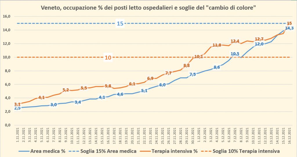 Il Veneto sfonda tre soglie in questi giorni: l’incidenza dei contagi di sars-cov2 con oggi, giovedì 16 dicembre, va sopra il valore di 500 (501 per la precisione; Belluno scavalca di colpo incidenza 300 e raggiunge quota 333, ma continua a restare parecchio sotto la media regionale); i posti letto occupati in terapia intensiva oggi sono il 15% del totale (ma comunque il totale dei letti veneti disponibili non è attivabile, lo ha ammesso anche Zaia, perché non c’è neanche lontanamente il personale sufficiente per far funzionare la dotazione intera); i posti letto occupati in area medica oggi sono il 14,3% del totale e la soglia critica per il cambio di colore, 15%, con ogni probabilità sarà superata domani.