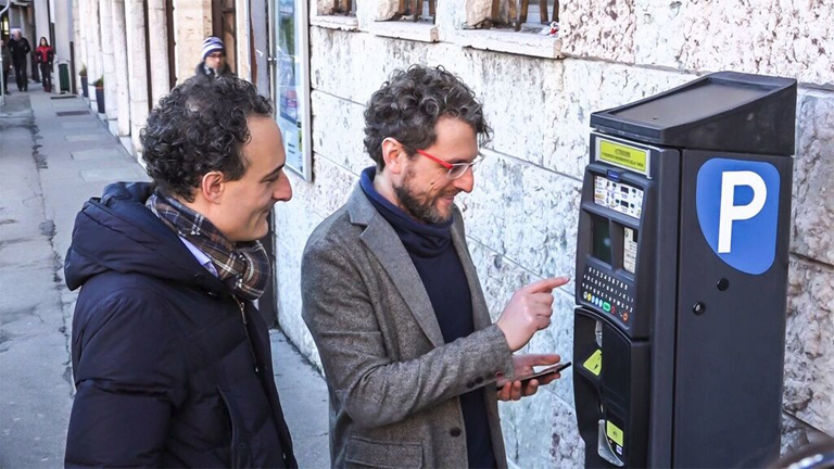 Sono operativi i controlli con il palmare e l’estensione della sosta (nella foto, da sinistra, il sindaco Jacopo Massaro e l’amministratore unico di Bellunum, Davide Lucicesare).