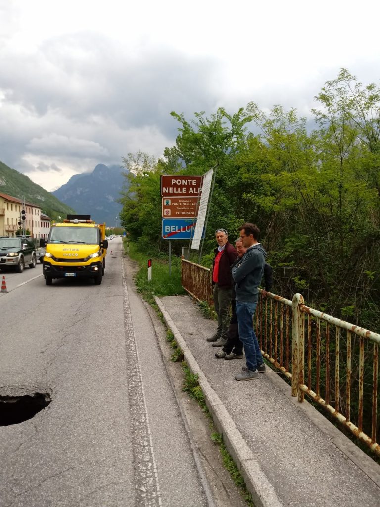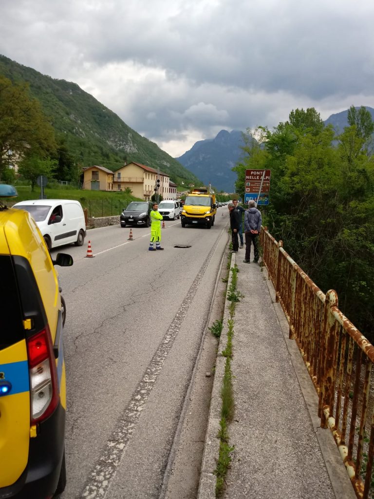 Una voragine sull’asfalto lungo la Statale 50, in località Andreane. Dal primissimo pomeriggio di oggi, venerdì 17 maggio, il tratto è a senso unico alternato, regolato da movieri. Siamo in comune di Ponte nelle Alpi, appena dopo il confine con Belluno, in via Caduti XIV Settembre 1944. Tra le 12.30 e le 13 un operaio dell’Anas, durante le quotidiane attività di controllo sulle strade di competenza dell’ente, ha notato una macchina che, transitando, finiva con una ruota in un avvallamento.