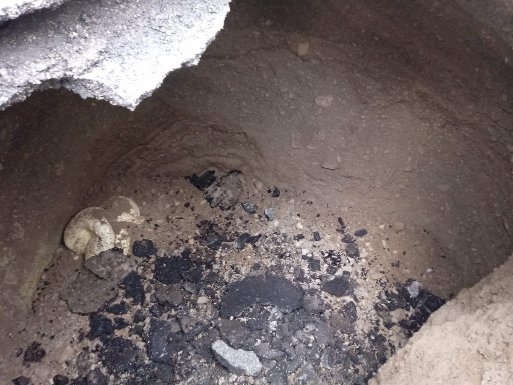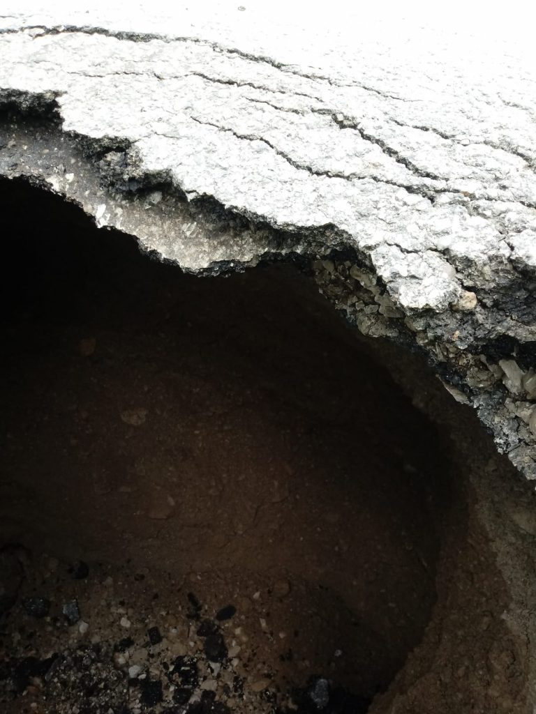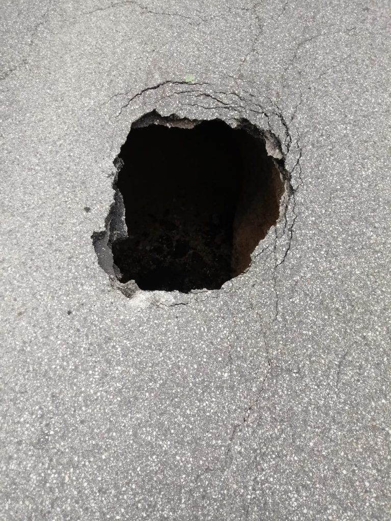 L’addetto ha immediatamente provveduto a bloccare il traffico e a mettere in piedi tutte le azioni utili per istituire il senso unico alternato. Ha poi aperto il buco con un piccone. In superficie la voragine misura circa un metro di diametro, ma scendendo si allarga, fino ad una profondità di 3 metri, per altrettanti di larghezza.
