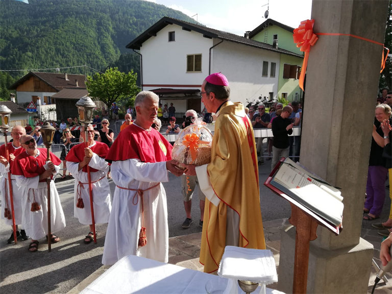 Anche oggi mons. Marangoni si è fermato come una volta a Pian del Vescovo dove è stato accolto dal sindaco Ornella Noventa, dal parroco don Giorgio Aresi e da tanta gente, anche in costume tradizionale. Poi, presso la chiesetta di questa frazione di Lamon, il vescovo ha presieduto la celebrazione della Messa che è stata resa solenne anche dai canti proposti dai cori locali.