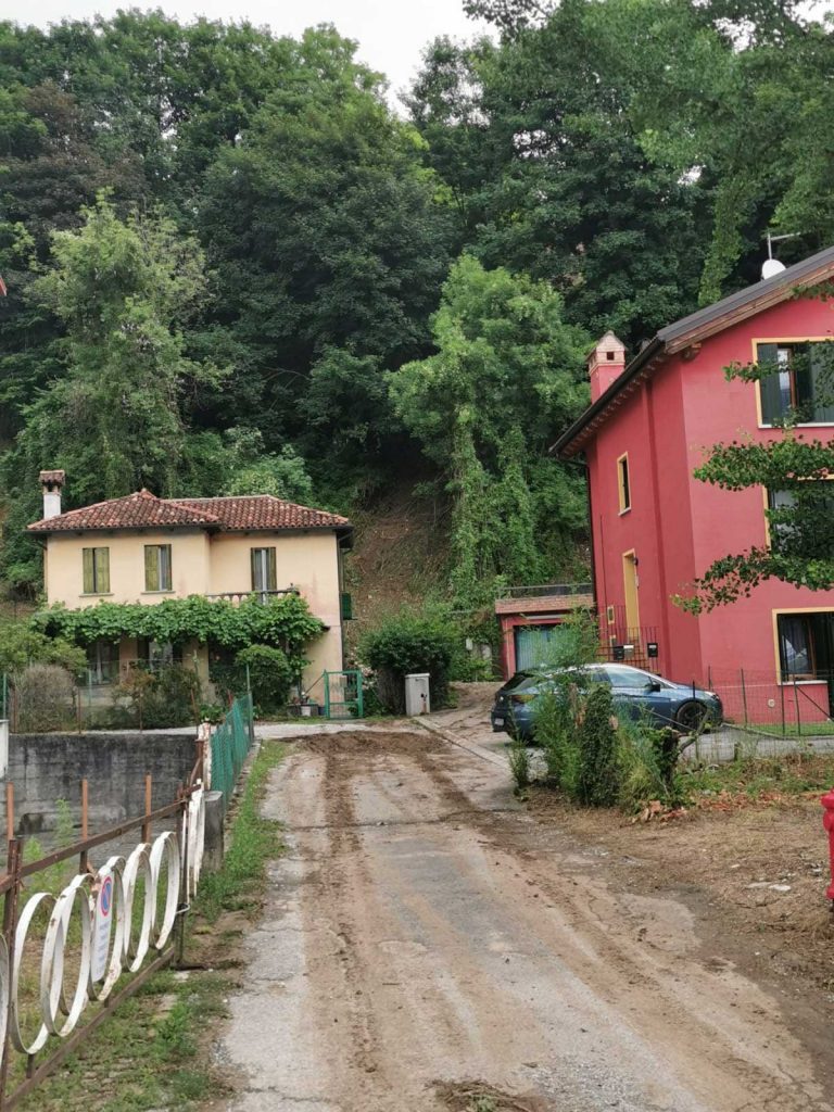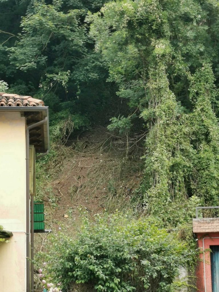Lo smottameto visto da via Rudio, Cavarzano. Alla base del versante ci sono le case di via San Francesco: sono state interessate dallo scivolamento di fango e detriti.