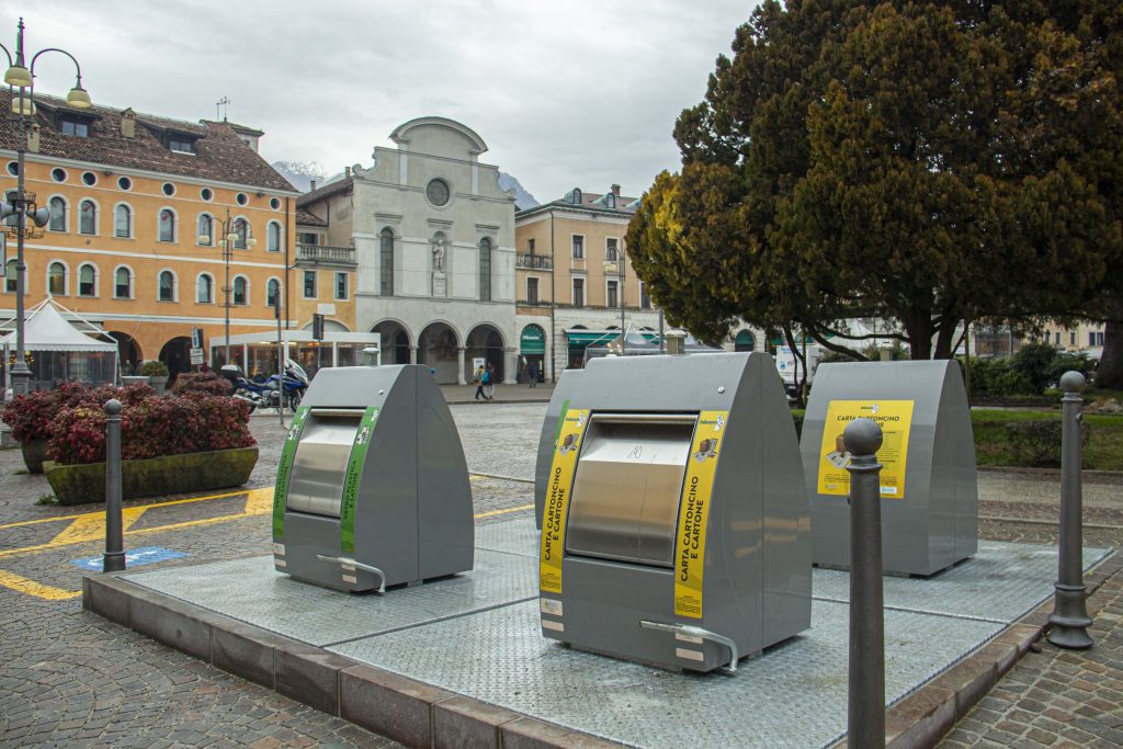 In piazza dei Martiri, a Belluno. Il prossimo step sarà la sostituzione di una delle campagne interrate per la carta con una destinata al rifiuto secco.