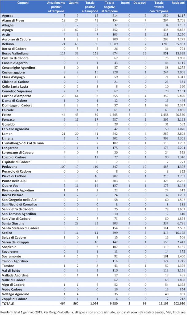 Oggi, lunedì 11 maggio, le persone positive al tampone del coronavirus in provincia di Belluno sono più di quattrocento, ma quasi la metà di esse si concentra in soli due Comuni, a causa della vasta diffusione del virus nelle case di riposo. Si tratta di Borgo Valbelluna e Pedavena. Nel capoluogo Belluno, nonostante l’elevata popolazione residente, il numero dei positivi risulta piuttosto basso, la metà rispetto a Feltre secondo centro della provincia. Qui sotto la tabella con tutti i dati, elaborata dall’Amico del Popolo su numeri forniti dalla Regione del Veneto.