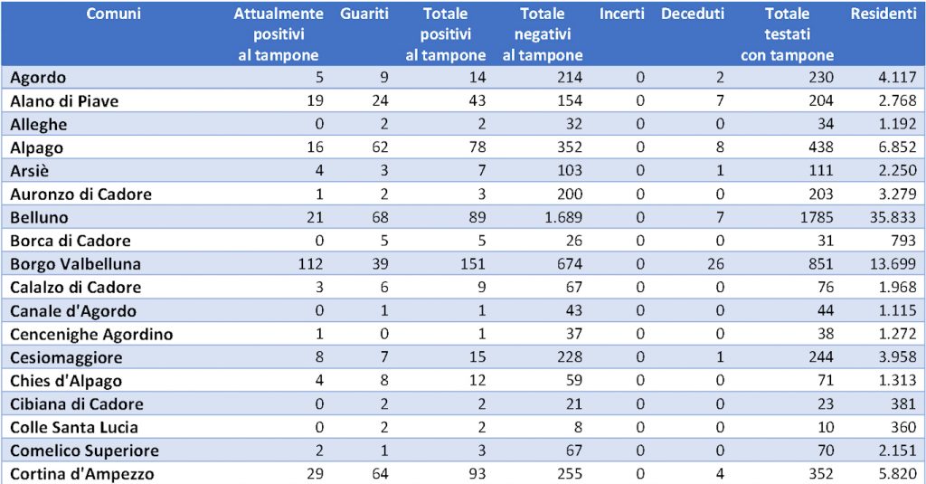 Oggi, lunedì 11 maggio, le persone positive al tampone del coronavirus in provincia di Belluno sono più di quattrocento, ma quasi la metà di esse si concentra in soli due Comuni, a causa della vasta diffusione del virus nelle case di riposo. Si tratta di Borgo Valbelluna e Pedavena. Nel capoluogo Belluno, nonostante l’elevata popolazione residente, il numero dei positivi risulta piuttosto basso, la metà rispetto a Feltre secondo centro della provincia. Qui sotto la tabella con tutti i dati, elaborata dall’Amico del Popolo su numeri forniti dalla Regione del Veneto.
