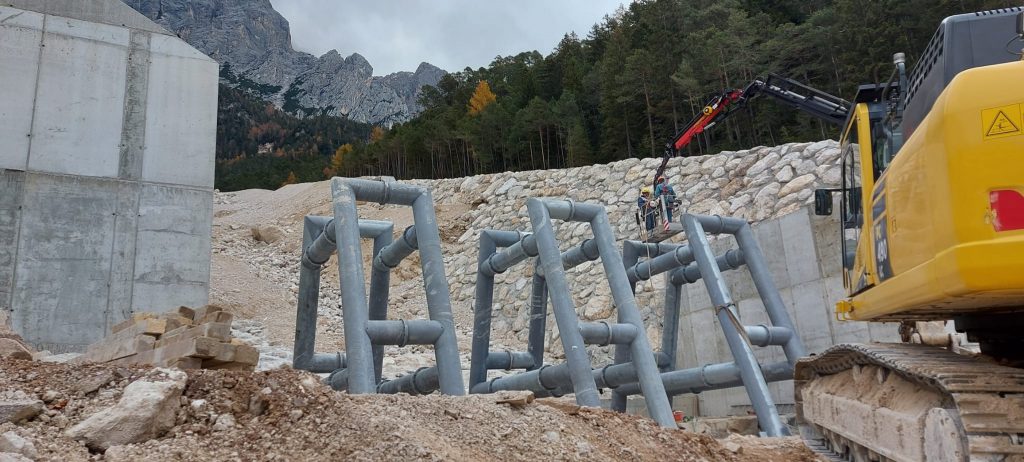 I tubi in acciaio arrivati qualche settimana fa sono stati installati oggi: la briglia Sabo Dam, la prima di tecnologia giapponese montata in Italia, comincia a prendere forma. E il cantiere di Cancia, a Borca di Cadore, vede la conclusione. Il primo stralcio – da 4 milioni 135 mila euro – prevedeva la realizzazione di tre operazioni: la deviazione del Bus del Diau e la creazione di una vasca di dissipazione per l’acqua (con separazione della colata liquida dalla parte solida); la risagomatura della rovina di Cancia; e soprattutto l’installazione di una grande briglia frangicolata alta circa 6 metri, per trattenere i massi delle eventuali colate detritiche.