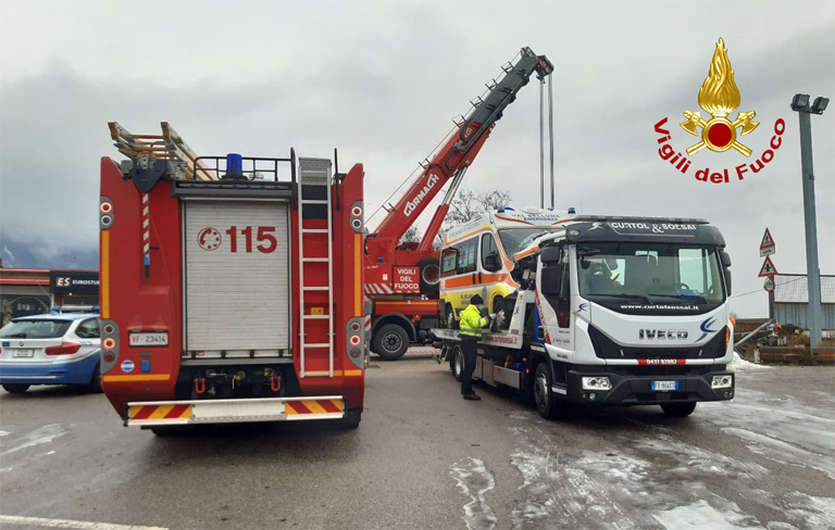 Alle 9.30 di oggi, domenica 24 gennaio, i vigili del fuoco sono intervenuti lungo la strada statale 51 di Alemagna, in via Cadore a Ponte nelle Alpi, per un’ambulanza di Valbelluna Emergenze che stava effettuando il trasferimento di un paziente, finita contro la spalla del ponte del cavalcavia della ferrovia.