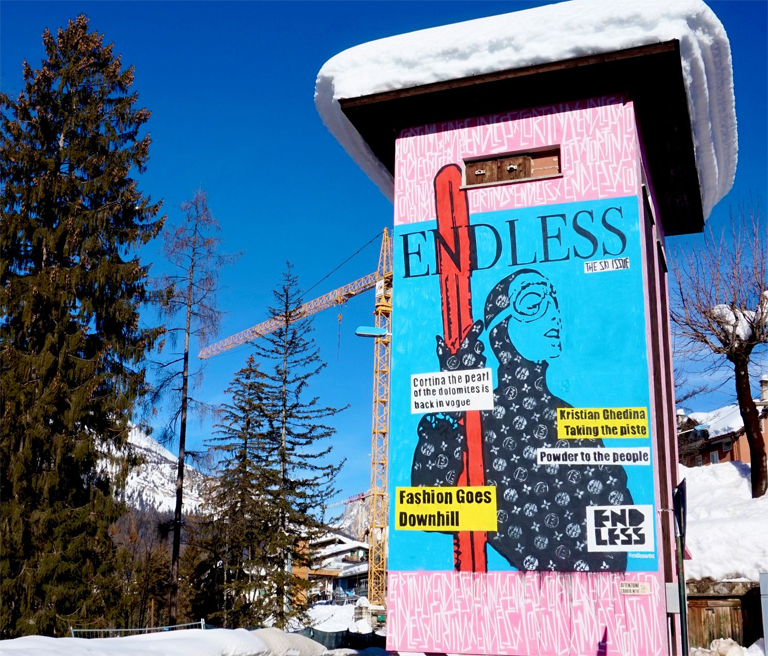 Per il murale sulla cabina elettrica all’angolo tra via del Parco e via Mons. P. Frenademez, Endless si è ispirato a una copertina retrò di Vogue del 1951, con una sciatrice in copertina. L’artista ha però completato la copertina con titoli divertenti relativi all’evento sportivo, uno dei quali fa riferimento a Kristian Ghedina, il locale campione di sci alpino: “Cortina the pearl of the dolomities is back in Vogue”; “Kristian Ghedina Taking the piste”; “Powder to the people”; “Fashion goes Downhill”.
