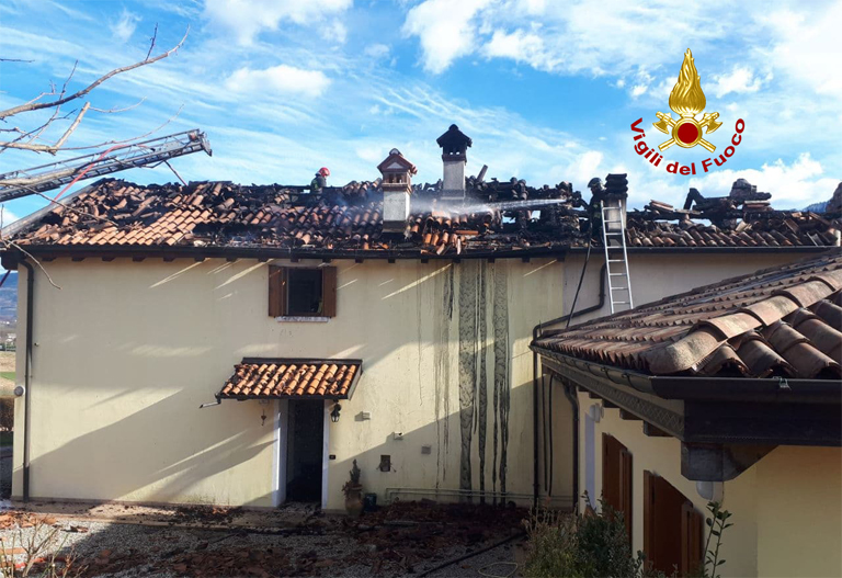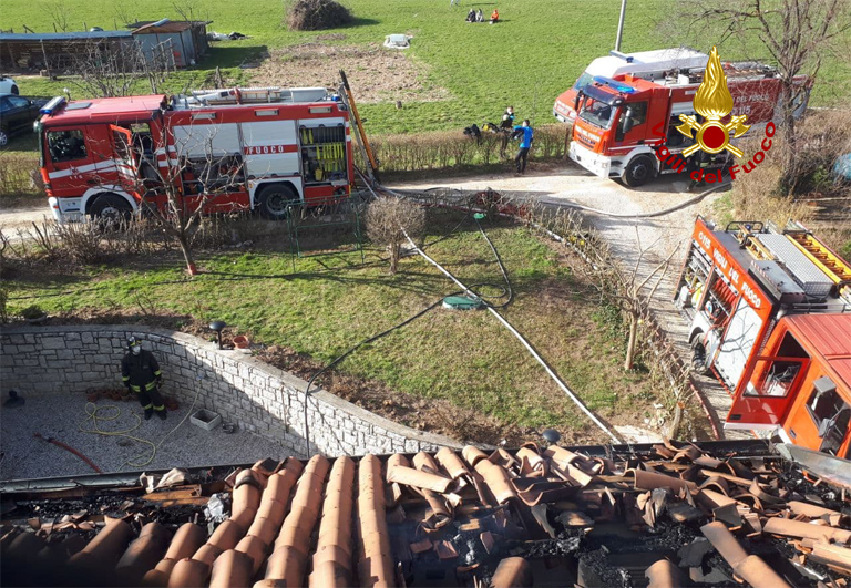 Gravemente danneggiato il tetto e il sottotetto in legno, danni da percolamento alla parte sottostante. I vigili del fuoco al lavoro per più di 6 ore.