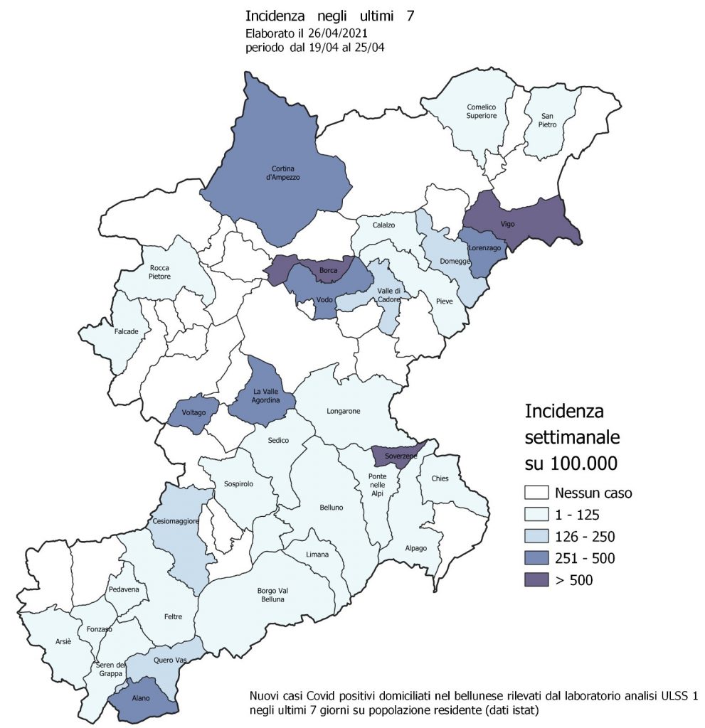 A fronte di questo dato confortante, nel report fornito oggi, lunedì 26 aprile, dall’Ulss Dolomiti relativo all’incidenza settimanale dei nuovi casi covid positivi ce ne sono altri che lasciano tranquilli e che devono spingere a continuare con grande attenzione e impegno nell’azione di contrasto alla circolazione del coronavirus. Ci sono infatti tre comuni bellunesi (la scorsa settimana era 1 e la precedente 2) in cui l’incidenza settimanale è stata superiore a 500 casi ogni 100 mila abitanti: si tratta di Vigo, Borca e Soverzene. L’incidenza è tra 251 e 500 a Cortina d’Ampezzo, Vodo, Lorenzago, La Valle Agordina, Voltago, Alano di Piave.
