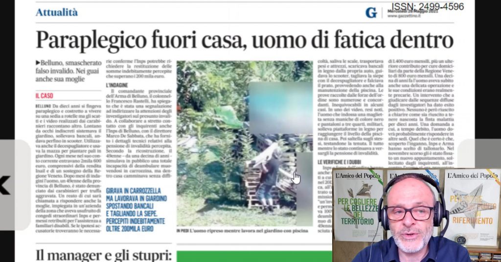 Finisce sulla prima pagina del fascicolo nazionale del Gazzettino la vicenda dell’invalido bellunese, ufficialmente costretto in carrozzina, che a casa propria svolgeva senza problemi lavori pesanti tali da comportare sforzi importanti per la sua schiena malandata (CLICCA QUI per guardare e commentare la Rassegna su FACEBOOK): si ipotizza la truffa (anche per la moglie, che fruiva dei vantaggi previsti per l’accompagnamento dei disabili) e forse scatterà l’obbligo di restituire i sussidi percepiti irregolarmente, si parla di 200 mila euro.