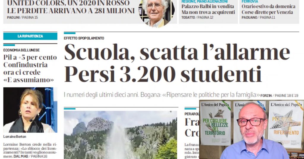 Quale futuro potrà mai avere la provincia di Belluno se non nascono bambini? La prima conseguenza drammatica è sotto gli occhi di tutti: le scuole dei più piccoli si svuotano pesantemente e il calo arriverà progressivamente alle medie e poi alle superiori (CLICCA QUI per guardare e commentare la Rassegna su FACEBOOK). Si parla di una riduzione del 25%. Negli ultimi nove anni persi 3.200 studenti. L’approfondimento importante del Corriere delle Alpi si sviluppa su due pagine, con intervista alla consigliera provinciale Serenella Bogana.