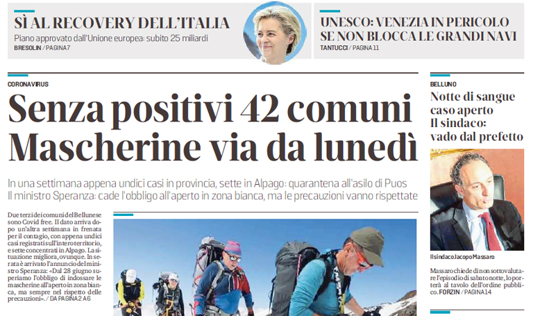 La Rassegna Stampa di RadioPiave inBlu condotta dai giornalisti dell’Amico del Popolo (al microfono Carlo Arrigoni) oggi, martedì 22 giugno, si apre ancora una volta parlando di pandemia e, in particolare, del fatto che due terzi dei Comuni del Bellunese sono Covid free, cioè non hanno nessuna persona contagiata dal coronavirus, e dell’annuncio del ministro Speranza che ha fatto sapere che dal 28 giugno, rispettando certe condizioni di sicurezza, non ci sarà più l’obbligo di indossare le mascherine all’aperto in zona bianca. Tra gli altri temi in risalto quello della fusione tra piccoli Comuni, con i commenti favorevoli di alcuni amministratori e preoccupati e negativi di altri loro colleghi. Poi ancora le reazioni alla notte di eccessi e violenze verificatasi a Belluno, la visita del prefetto ai lavoratori della Acc di Mel e della Ideal Standard di Trichiana, la conferma della presenza dello sciacallo dorato in Comelico, i contributi alle famiglie in crisi per la pandemia.