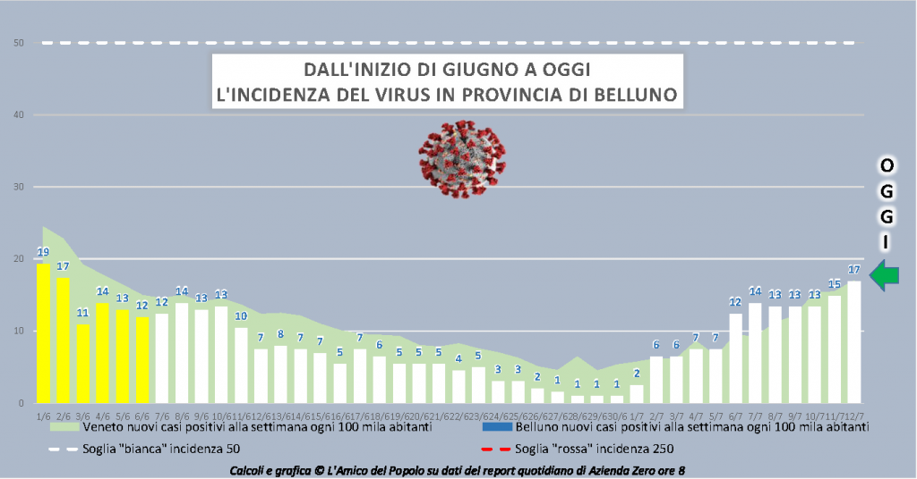 Oggi, lunedì 12 luglio, l’incidenza su base settimanale del coronavirus in provincia di Belluno risulta al valore di 17, come del resto il Veneto (ombra verde nel grafico). Siamo tornati indietro all’incidenza del 2 giugno, quando il Veneto era ancora “zona gialla”. Dopo molte settimane di calo, da una decina di giorni la tendenza si è invertita e l’incidenza continua a crescere. Siamo ancora ben lontani dalla “soglia 50” sopra la quale una regione può essere dichiarata Zona Gialla, ma se non stiamo attenti andando avanti con questo ritmo potremmo superarla di nuovo in agosto e tornare “in giallo”.