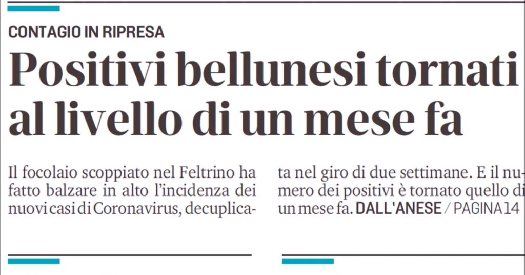 Lo vedremo tra una decina di giorni, quanto sarà salato il conto del tifo urlato a squarciagola, senza mascherine, senza distanziamenti: Gazzettino e Corriere delle Alpi di oggi dedicano i titoli in prima pagina alla ripartenza dei contagi di coronavirus, ma stavolta è “variante delta”, che si trasmette più facilmente (CLICCA QUI per guardare e commentare la Rassegna su FACEBOOK). I numeri già di per sé dovrebbero preoccupare, perché siamo tornati ai valori di un mese fa, quando eravamo “in giallo” (L’Amico del Popolo ve l’ha già mostrato ieri: https://www.amicodelpopolo.it/2021/07/12/virus-non-ce-dubbio-i-contagi-sono-ripartiti/). Ma dobbiamo aspettarci di peggio perché la festa per l’Italia del calcio quasi sicuramente lascerà segni. E già si calcola che per l’inizio di agosto in alcune regioni potrebbero tornare le restrizioni da Zona Gialla. Nel Veneto preoccupa la progressione di crescita di contagi più rapida che altrove.