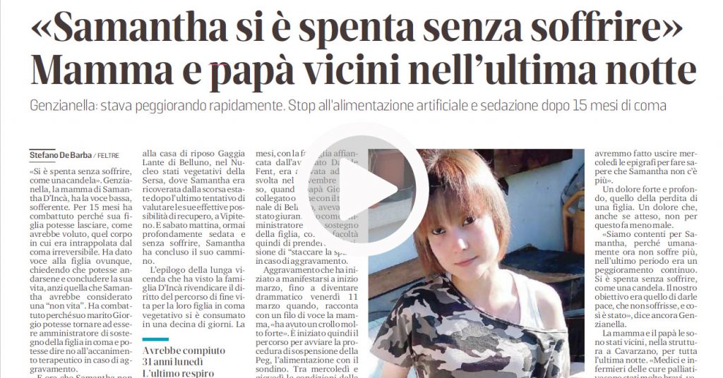 È morta Samantha D’Incà, la trentenne feltrina che si trovava in stato vegetativo da 15 mesi, ospite della Sersa a Belluno. Nei giorni scorsi un crollo delle sue condizioni di salute generali ha determinato l’attuazione del protocollo previsto. Il suo caso è salito alla ribalta nazionale perché Samantha non aveva lasciato disposizioni scritte sul fine vita tuttavia i genitori, interpretando alcune sue frasi pronunciate di fronte al caso di Eluana Englaro, volevano che fosse terminato il suo stato di coma.