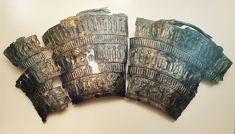 Una premessa condivisa anche da Eugenio Padovan che 20 anni fa ha trovato il reperto a Pian de la Gnela con il circolo «Amici del Museo dell’Alpago», di cui oggi è presidente: «Si tratta di un importantissimo reperto funerario con istoriate figure evocative di imprese o di leggende su tre fasce, con una scena di parto unica in quest’arte». Giunto sino a noi in forma di ventaglio, per via dello schiacciamento provocato dalle lastre che costituivano la tomba che la conteneva, il reperto è tuttavia in buone condizioni e ed è stato oggetto inoltre di una sorprendente ricostruzione in bronzo. «Voglio aggiungere in questa occasione un ricordo personale», ha proseguito Padovan, «perché fui proprio io che mi accorsi, durante la ripulitura della superficie bronzea, della presenza delle incisioni costituite da personaggi con i costumi dell’epoca (VI-V secolo a.C.)». Dopo la conclusione delle operazioni di scavo il reperto è stato trasportato a Padova e non ha fatto più ritorno alla sua terra di origine, ma è stato esposto con grande successo e apprezzamenti, per la prima volta, nella mostra «Venetkens-Viaggio nella terra dei Veneti Antichi».