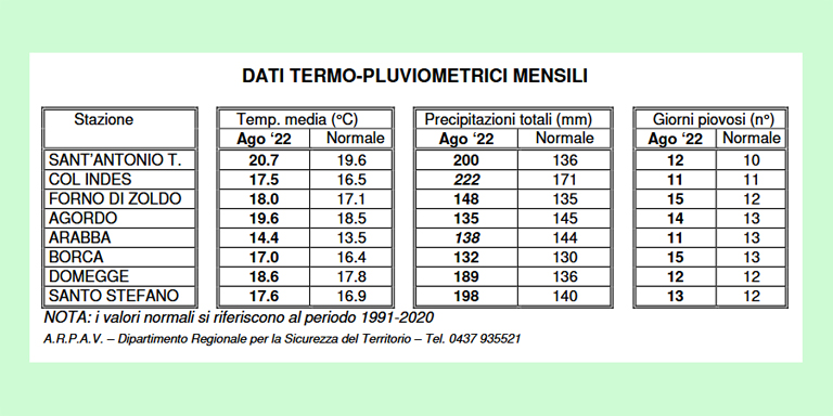 Per quanto riguarda agosto, questo mese in provincia di Belluno è risultato un po’ più caldo e soleggiato del normale, con precipitazioni nella norma o addirittura superiori in alcune zone. Nel corso del mese – spiegano gli esperti di Arpav – si è avuta la consueta instabilità di questo mese estivo, ma anche numerose giornate di bel tempo (16, contro una media di 12). La fase di tempo più soleggiato e stabile si è avuta dal 21 al 24.
