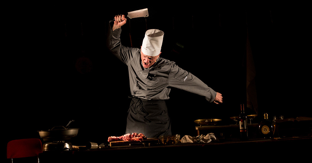 Questa riduzione a monologo della celebre tragedia shakespeariana è ambientata in una cucina povera, tra pentole, coltelli e vasellame: una grande tavola, coperta da un damascato rosso, accanto al libro delle ricette una bottiglia di vino, patate, cipolle, una bilancia e un coltello conficcato nel legno, di lato piantine di salvia e rosmarino, mentre a scaldare le vivande ci sono due fornelli elettrici che mandano in ebollizione una padella e una pentola. In questo contesto culinario, dove anche i vapori hanno spessore drammaturgico, Luca Radaelli, in veste di cuoco, entra ed esce dalle varie parti che il testo gli affida, dando voce ai vari personaggi – da Macbeth al Signore di Cawdor, dalla Lady alle streghe che parlano e profetizzano in dialetto lombardo – e dialogando con la chitarra di Maurizio Aliffi in una vera e propria rappresentazione musical/culinaria di quella che è forse la tragedia più sanguinaria di Shakespeare, emblematica nel mostrare come la brama di potere possa portare facilmente alla rovina.