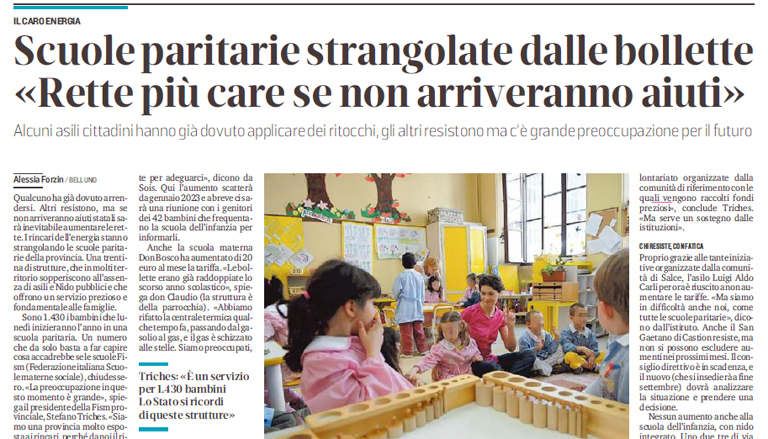 La rassegna stampa di RadioPiave inBlu condotta dai giornalisti dell’Amico del Popolo (al microfono Carlo Arrigoni) oggi, sabato 10 settembre, si apre con la notizia delle difficoltà che incontrano le scuole paritarie bellunesi a causa del caro energia: se non arriveranno aiuti dallo Stato – spiegano i rappresentanti delle strutture che in provincia ospitano più di 1.400 bambini – sarà inevitabile dover aumentare i costi di iscrizione. Tra gli argomenti di carattere nazionale e internazionale oggi sono in primo piano la salita al trono d’Inghilterra di Carlo III dopo la morte della regina Elisabetta e le notizie relative alla campagna elettorale. Per quanto riguarda la provincia di Belluno spazio all’annuncio della celebrazione prevista domani a Canale d’Agordo per festeggiare la beatificazione di Papa Luciani, ma anche alla voglia di Alto Adige di Livinallongo e Colle Santa Lucia, all’interruzione per lavori, fino a fine ottobre, del passaggio dei treni sulla Ponte-Calalzo, all’inaugurazione a Longarone Fiere del Festival delle Foreste, al piano per i lavori di sistemazione della strada che porta in Zoldo.