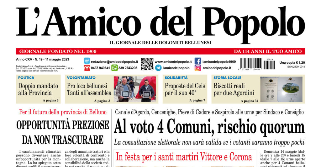 La festa per i santi martiri Vittore e Corona nella fotonotiza in prima pagina; domenica 14 maggio Canale d’Agordo, Cencenighe, Pieve di Cadore e Sospirolo alle urne per le scelte del Sindaco, importante raggiungere il Quorum per evitare il commissariamento (pagg. 1 – 11 – 19 -23); doppio mandato alla Provincia di Belluno (pag. 2); cambiamenti climatici, se ne è parlato in un convegno a Belluno (pag. 3); Andrea Canal ordinato diacono (pag. 5); incontro dedicato all’Africa con la presenza di Padre Daniele Moschetti (pag. 6); iniziative del Ceis in occasione dei suoi 40 anni (pag. 7); a Belluno un primo incontro per l’evento olimpico del 2026 (pag. 10); a Sedico dal 1 giugno arriva un nuovo medico di base (pag. 12); ad Agordo in località Valcozzena, il Comune vende terreni edificabili (pag. 25); in Val di Zoldo, festa del volontariato (pag. 26); la macchina organizzativa dell’Alpago Bike Funtastic è già al lavoro (pag. 27); organizzato a Fonzaso un incontro in occasione della Giornata mondiale del tumore ovarico (pag. 31).