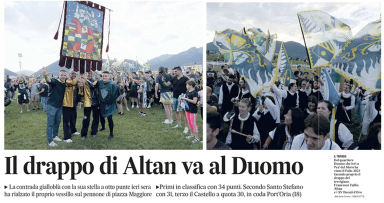 Il Palio di Feltre è stato vinto dal quartiere Duomo davanti a Santo Stefano, Castello e Portoria. Questa la notizia di apertura della rassegna stampa di RadioPiave inBlu di oggi, lunedì 7 agosto, condotta dai giornalisti dell’Amico del Popolo (al microfono Carlo Arrigoni). Tra le altre news da segnalare quella relativa ai prossimi lavori alla Galleria Comelico per i quali si sta cercando di individuare gli orari migliori in cui prevedere il passaggio delle auto per pesare il meno possibile sulle possibilità di accesso alla valle. E poi la notizia relativa agli atti del processo del Vajont con la richiesta del sindaco di Longarone di non farli tornare a L’Aquila, ma di mantenerli a Belluno. Da segnalare anche il racconto della cerimonia per la pace svoltasi ieri a Cima Grappa e le numerose cronache sportive a partire da quella riguardante la cronoscalata automobilistica che ieri ha interessato il Nevegàl.