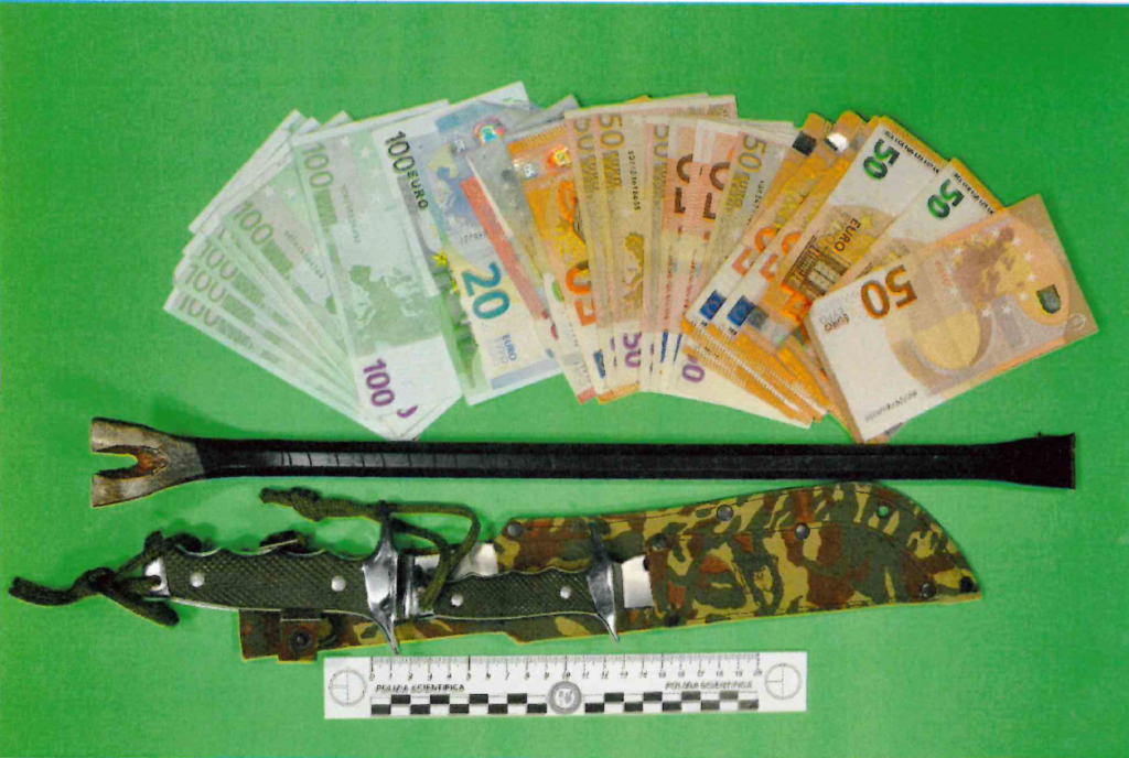 All’interno dell’auto, dietro al sedile e parzialmente occultati, sono stati rinvenuti un arnese atto allo scasso, nella fattispecie un palanchino (“piede di porco”) in metallo di circa 50 centimetri, e due coltelli con la punta acuminata e la lama affilata in entrambi i lati. Il conducente aveva con sé circa 2.000 euro in denaro contante.