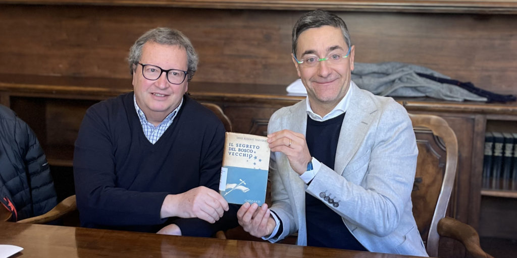 Si tratta del secondo romanzo «Il segreto del bosco vecchio» (dopo «Barnabo delle montagne» edito nel 1933), pubblicato nel 1935 da F.lli Treves editore di Milano, scritto da Dino Buzzati Traverso, con il doppio cognome, come allora l’autore si firmava. L’edizione ha una peculiarità che la rende rara, perché è uscita nel 1939, l’anno successivo all’approvazione delle leggi razziali. Queste ultime furono un insieme di provvedimenti legislativi e amministrativi applicati in Italia fra il 1938 e l’aprile del 1945, inizialmente dal governo fascista e poi dalla Repubblica Sociale Italiana, rivolti prevalentemente contro le persone ebree. Per questo motivo i fratelli Pietro e Paolo Treves, di origine ebrea, dovettero emigrare a Londra, concludendo così oltre mezzo secolo di storia editoriale italiana, dato che Treves era stato l’editore di riferimento per la grande letteratura e, in generale, l’editoria di qualità destinata al grande pubblico.