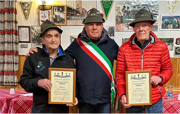 Nel corso della breve cerimonia il sindaco Danilo De Toni si è complimentato con gli ultranovantenni e poi ha consegnato un attestato di ringraziamento a due alpini alleghesi intervenuti nel disastro del Vajont, Mario Del Negro e Renato Del Zenero che all’indomani del 9 ottobre 1963 si sono aggiunti ai tanti soccorritori nel teatro della tragedia.