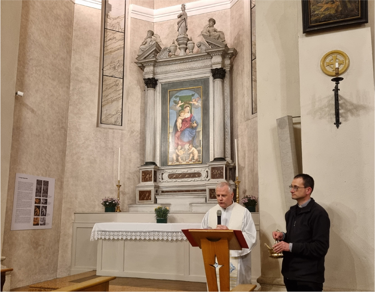 Alle spiegazioni artistiche e tecniche sono seguiti lo scoprimento della pala da parte dei due parroci don Sandro Gabrieli e don Giancarlo Gasperin e poi un momento di preghiera e di riflessione che ha avuto al centro la figura della Madonna e che si è avvalso anche dell’efficace e solenne accompagnamento offerto dalla locale Schola Cantorum. Tra l’altro è stata sottolineata la capacità che ha avuto Maria di fidarsi di Dio e di accogliere Gesù, una capacità da prendere da esempio e da domandare nella preghiera anche per la propria vita.