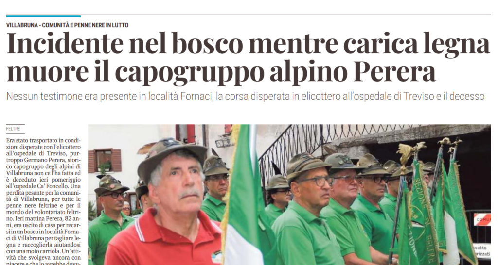 Era stato trasportato in condizioni disperate con l’elicottero all’ospedale di Treviso, purtroppo Germano Perera, storico capogruppo degli alpini di Villabruna non ce l’ha fatta ed è deceduto ieri pomeriggio all’ospedale Ca’ Foncello. Una perdita pesante per la comunità di Villabruna, per tutte le penne nere feltrine e per il mondo del volontariato feltrino. Ieri mattina Perera, 82 anni, era uscito di casa per recarsi in un bosco in località Fornaci di Villabruna per tagliare legna e raccoglierla aiutandosi con una moto carriola.