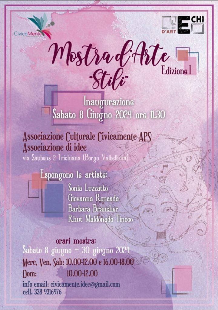Dopo la mostra collettiva “Echi d’Arte”, che nel mese di febbraio ha visto un significativo afflusso di visitatori alla scoperta di trenta artisti; dopo il “Simposio di scultura” che ad aprile ha coinvolto sei scultori nella mostra “Tracce di memoria-il valore del ricordo” tenutasi; dopo la mostra retrospettiva in ricordo di dodici artisti scomparsi; ora la proposta artistica “Echi D’Arte” diventa una mostra di pittura di quattro artiste, intitolata “Stili”: è stata inaugurata sabato 8 giugno alle ore 11.30 presso la sede dell’Associazione a Trichiana in Via Saubens (Borgo Valbelluna) e resterà aperta fino al 30 giugno, con questo orario: Mercoledì, venerdì e sabato dalle 10 alle 12, dalle 16 alle 18; la domenica dalle 10 alle 12. Informazioni: civicamente.idee@gmail.com; cell. 338 9316976.