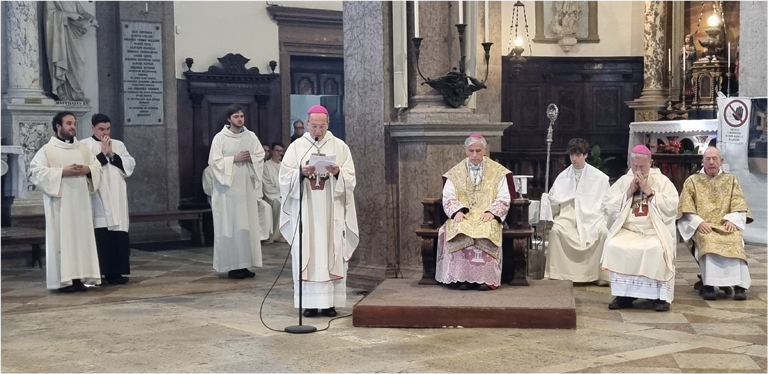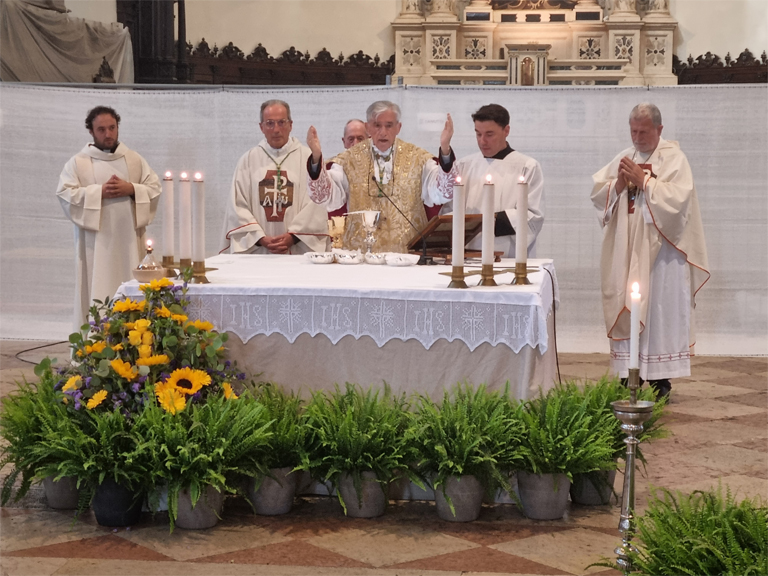 All’inizio della sua omelia monsignor Andrich ha rivolto parole di ringraziamento ai due vescovi presenti e al patriarca «per la fraterna comprensione», sottolineando pure di non poter dimenticare il vescovo Vincenzo Savio e il fatto che nel periodo appena precedente alla sua morte ebbe a cuore di mostrarci il trionfo di Cristo raffigurato dal Beato Angelico perché avessimo ad amare Chi ci aspetta.