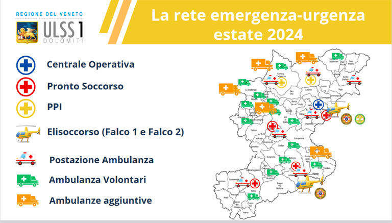Novità del 2024 è l’attività di un’ambulanza con infermiere nei sabati e festivi con base ad Alleghe (con personale Ulss e del Coordinamento Agordino) e un’ambulanza ulteriore in Alpago (con Eva Alpago) operativa dalle 20 alle 8 nei venerdì e sabato di luglio e agosto. Questi due mezzi, e i relativi equipaggi, si aggiungono ai mezzi di Croce Bianca a Cortina, Livinallongo e di Castelmonte ad Auronzo.