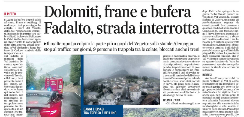Dall’Agordino al Comelico, da Zoldo al Feltrino: sono state numerose le zone della provincia di Belluno che ieri hanno registrato danni a causa dei forti temporali che, complici anche violente raffiche di vento, hanno provocato frane, allagamenti e cadute di alberi, bloccando anche la strada statale di Alemagna poco sotto il Fadalto. Questa la notizia di apertura della rassegna stampa di RadioPiave inBlu di oggi, sabato 13 luglio, condotta dai giornalisti dell’Amico del Popolo (al microfono Carlo Arrigoni). Tra le altre news da evidenziare il punto dell’Ulss Dolomiti sulla Case di comunità e sugli Ospedali di comunità a servizio del territorio bellunese e poi l’incontro organizzato a Cortina da Confartigianato Belluno con la presenza della ministra Santanché che ha esortato a pensare anche ad un aeroporto a servizio del turismo internazionale. Tra le tante cronache sulle attività che animano in questo periodo il territorio bellunese anche quella relativa al Festival degli aquiloni in programma in Alpago.