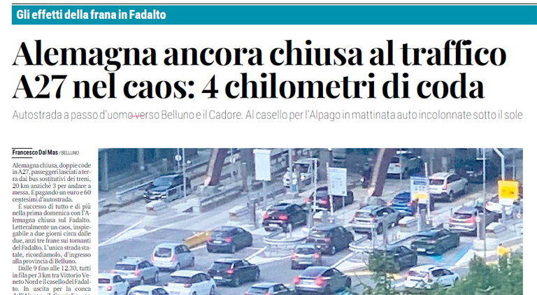 La chiusura della strada statale di Alemagna nei pressi del Fadalto a causa delle frane cadute a seguito dei forti temporali della settimana scorsa ha provocato difficoltà e problemi a chi nel fine settimana voleva raggiungere la provincia di Belluno: ieri si sono formate lunghe code ai caselli autostradali e il giorno precedente non sono mancati i disservizi anche per chi aveva scelto di viaggiare con le Ferrovie dal momento che il bus sostitutivo del treno atteso a Vittorio Veneto non è mai arrivato. Questa la notizia di apertura della rassegna stampa di RadioPiave inBlu di oggi, lunedì 15 luglio, condotta dai giornalisti dell’Amico del Popolo (al microfono Carlo Arrigoni). Tra le altre news da evidenziare le difficoltà segnalate dal sindaco di Val di Zoldo per il passaggio, senza controlli, di tanti motociclisti e le cronache di numerose manifestazioni che hanno caratterizzato ieri il territorio provinciale: dalla festa dell’Orzo a Pedavena, al Festival degli aquiloni in Alpago, alla celebrazione dei 70 anni del Gruppo Ana di Campolongo di Cadore. Senza dimenticare anche tanti eventi sportivi, a partire dall’incontro di calcio che ha visto la squadra di Auronzo confrontarsi con i giocatori della Lazio.