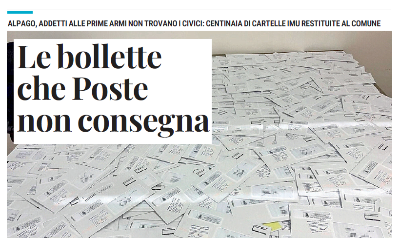 Disguidi e disservizi nella consegna della corrispondenza nel comune di Alpago. A denunciare il perdurare della situazione è lo stesso sindaco, Alberto Peterle. Restituite al mittente, cioè in municipio, ben 322 cartelle Imu sulle 3.793 inviate.