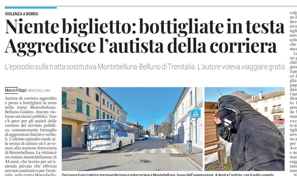 Autista di corriera aggredito e preso a bottigliate in testa nella tratta Montebelluna-Belluno-Calalzo. L’episodio risale alla serata di sabato ed è avvenuto alla stazione ferroviaria di Montebelluna. La vittima è un autista montebellunese di 44 anni, che lavora per un’azienda privata che effettua servizio sostitutivo per Trenitalia.