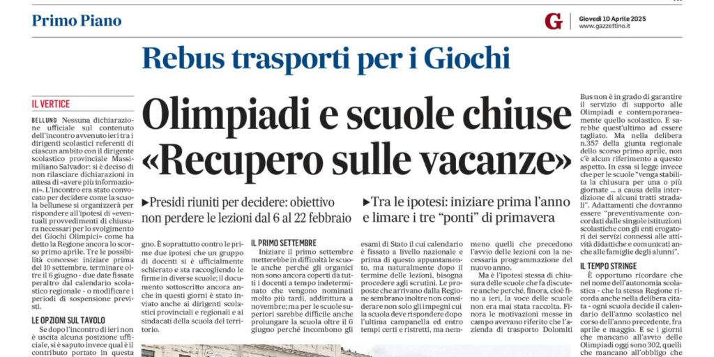 I presidi cercano di trovare la “quadra” per le Olimpiadi, a febbraio 2026 alcune scuole dovranno fermarsi per un paio di settimane, come recuperare quei giorni? Si ragiona sulla possibilità di “limare” le vacanze tradizionali dell’inverno, a Pasqua, al primo maggio.