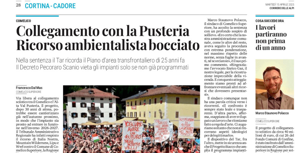 Respinto il ricorso degli ambientalisti, avanti con il progetto del collegamento sciistico fra il Comelico e la Pusteria: il pronunciamento del Tar è dettagliato e si sviluppa su 54 pagine.