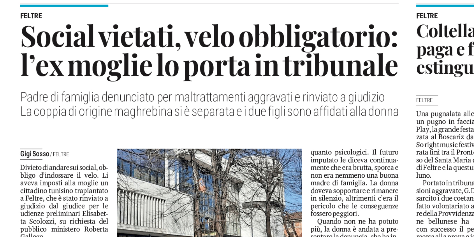 Finirà a processo la vicenda di una coppia di tunisini residenti a Feltre, si sono separati, lei ha ottenuto l’affidamento dei due figli, lei ha denunciato lui per i maltrattamenti che avvenivano quando erano insieme, lui la insultava, la umiliava, le impediva di usare i social, le impediva di uscire da sola, doveva sempre portare il velo islamico. La donna ha deciso di servirsi della legge, la legge italiana.