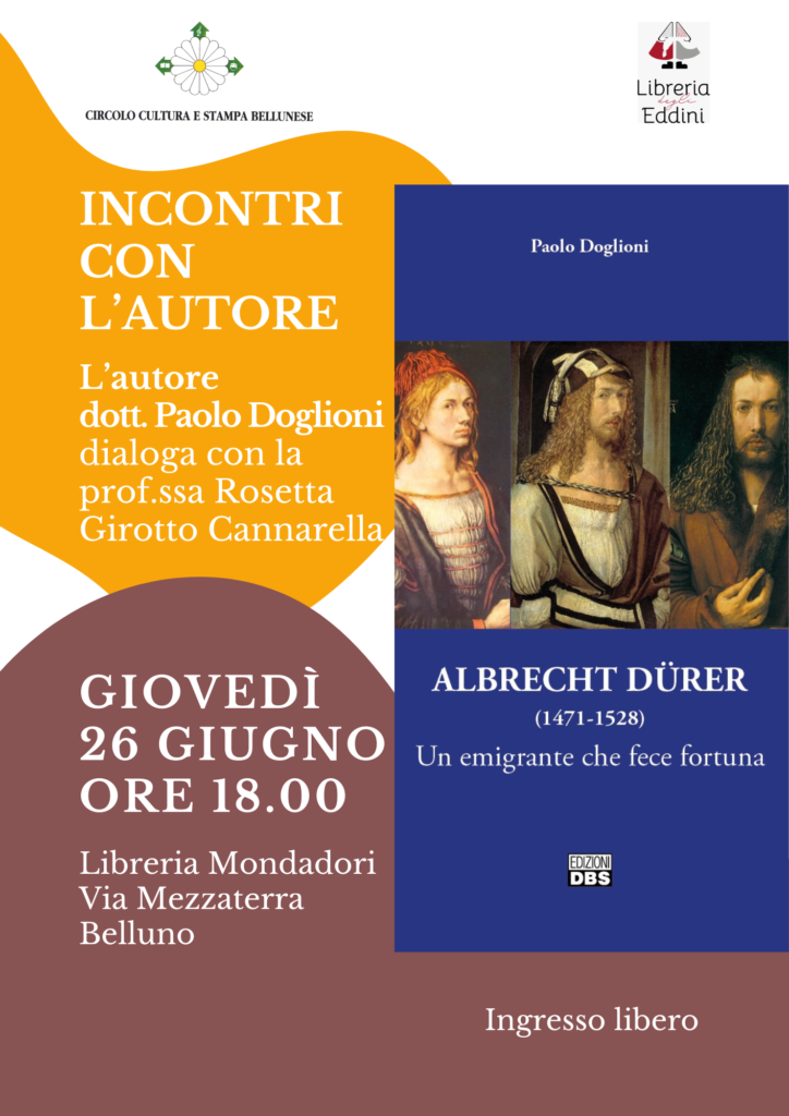 Giovedì 26 giugno, alle ore 18.00, la Libreria Mondadori di via Mezzaterra, a Belluno, ospiterà un incontro con Paolo Doglioni in occasione dell’uscita del suo nuovo libro Albrecht Dürer (1471-1528). Un emigrante che fece fortuna, pubblicato da DBS edizioni. L’evento, organizzato dal Circolo Cultura e Stampa Bellunese, vedrà l’autore dialogare con la professoressa Cannarella Girotto.