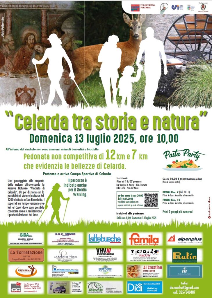 Domenica 13 luglio 2025 la frazione di Celarda, nel Comune di Feltre, ospiterà l’ottava edizione della manifestazione podistica “Celarda tra storia e natura”, promossa dalla Polisportiva Feltrese. Si tratta di una corsa non competitiva, aperta anche agli appassionati di Nordic Walking, che si snoda lungo due percorsi di 12 e 7 chilometri.