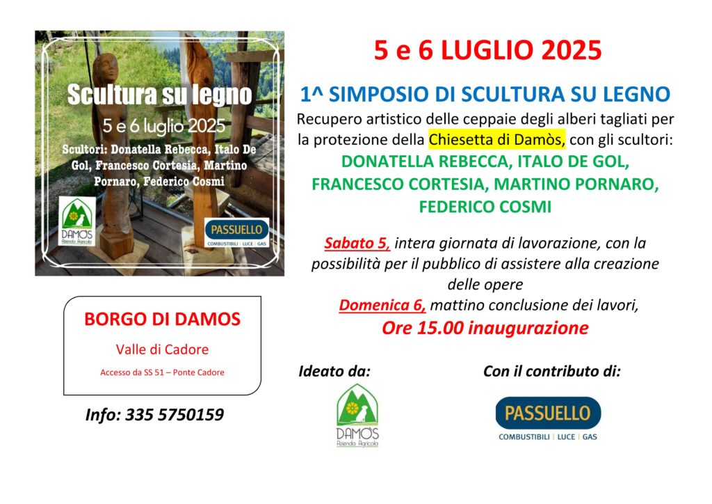 Nel fine settimana del 5 e 6 luglio 2025, il borgo di Damòs, in Cadore, ospita il primo Simposio di Scultura intitolato “Antico Borgo”, promosso dall’Azienda Agricola Damòs nell’ambito delle attività legate al turismo rurale. L’iniziativa nasce con un intento duplice: da un lato la valorizzazione del paesaggio e delle tradizioni montane, dall’altro la salvaguardia dell’antica chiesetta trecentesca del borgo, minacciata da eventi atmosferici estremi.