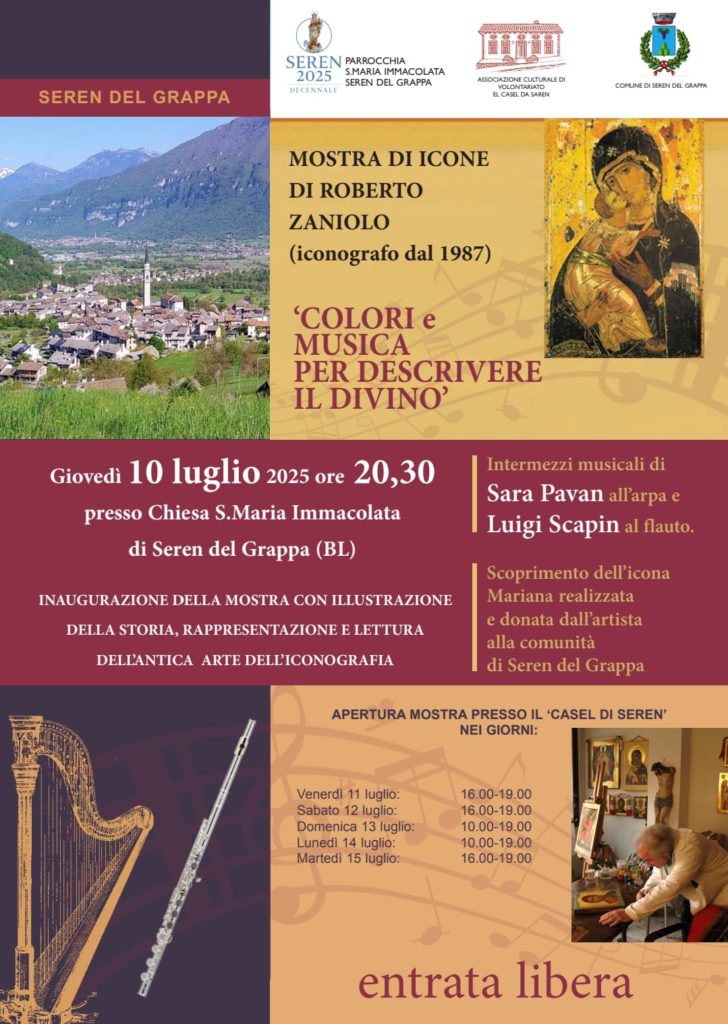 Proseguono a Seren del Grappa le iniziative legate al Decennale. Tra gli appuntamenti più attesi, giovedì 10 luglio alle ore 20.30, nella chiesa parrocchiale, si terrà la serata intitolata Colori e musica per descrivere il Divino, dedicata alla scoperta del mondo delle icone.