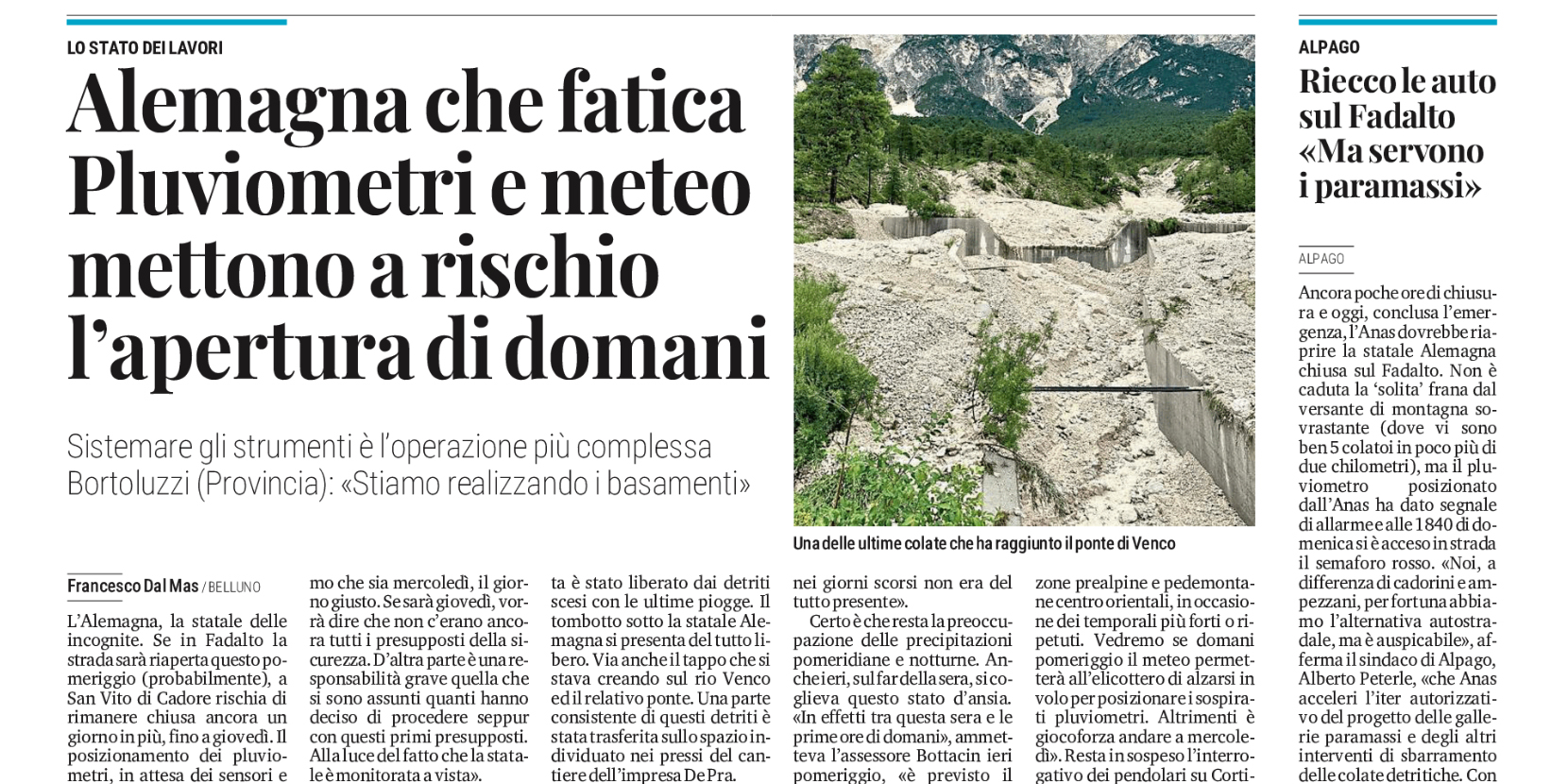 Sui quotidiani si dà conto dei lavori per collocare i sensori, indispensabili per la parziale riapertura dell’Alemagna che era stata prevista per domani, mercoledì: a questo punto, dopo la colata di stanotte, bisognerà attendere le nuove valutazioni.